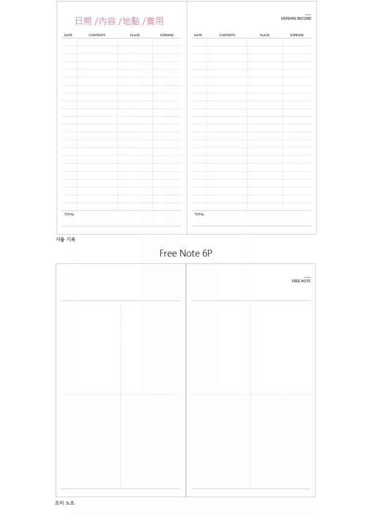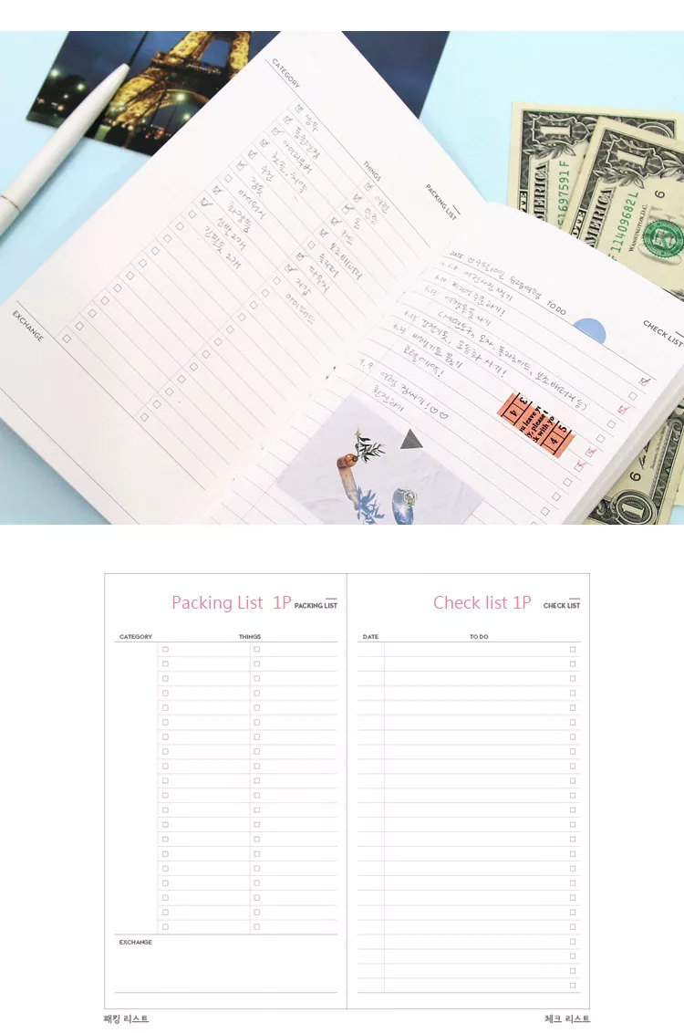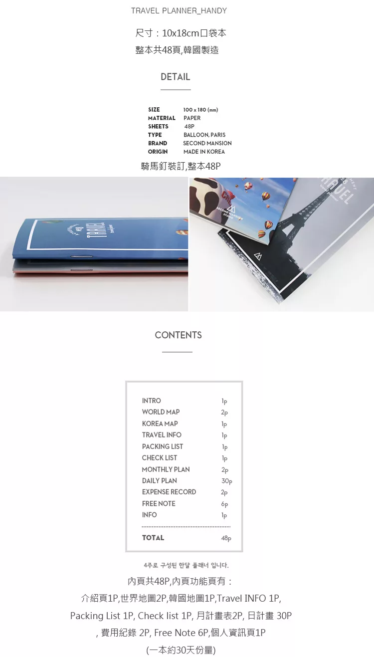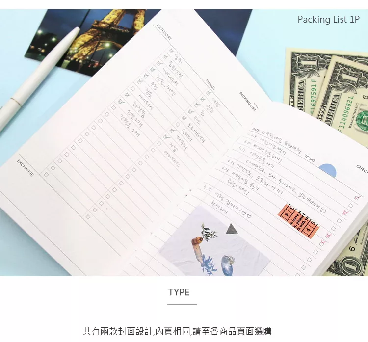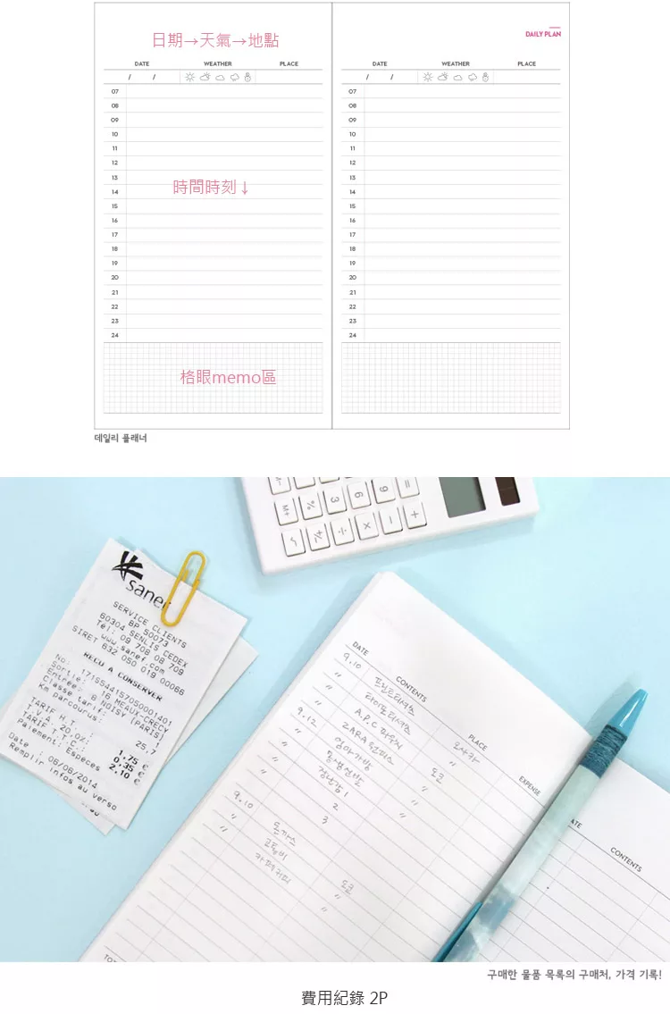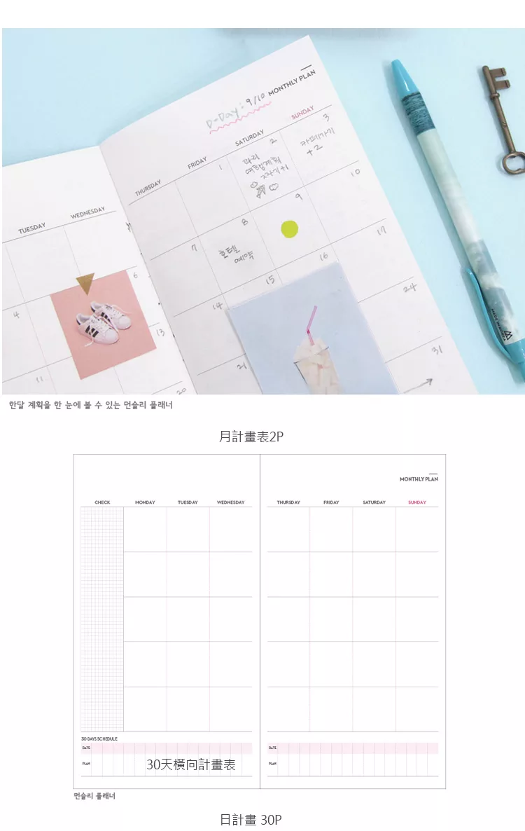 +Check list 1P+月計畫表2P+日計畫 30P+費用紀錄 2P+Free Note 6P+個人資訊頁1P。